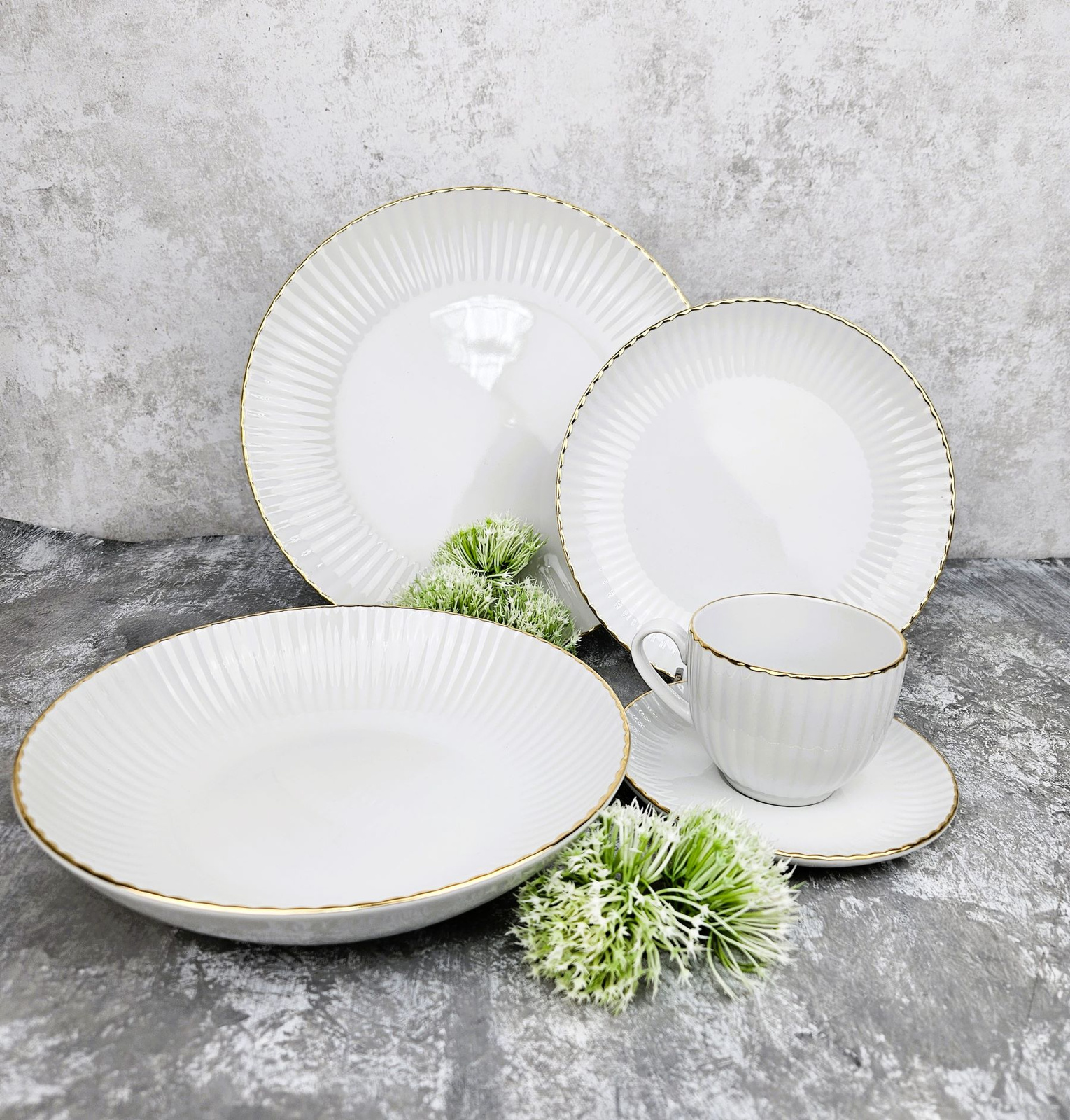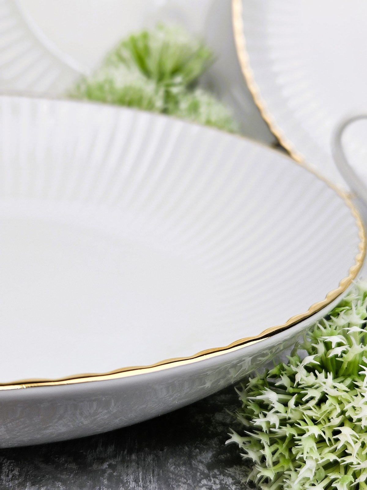 Reliefowa forma kolekcji Daisy przypomina płatki rozkwitającej stokrotki. Tak wdzięczny, kwiatowy motyw potrzebuje wyjątkowej oprawy. W połączeniu z delikatnym, ręcznie wykonanym złotym zdobieniem zaspokaja potrzeby nawet najbardziej wymagających estetów. Wysokie parametry jakościowe sprawiają, że Daisy Gold Line jest nie tylko piękna, ale niezwykle wytrzymała i funkcjonalna. Dzięki temu doda uroku codziennej aranżacji stołowej w domu, jak również w przestrzeni restauracyjnej czy kawiarni. Daisy Gold Line dostępna jest jako zestaw obiadowy dla 6 osób, składający się z 30 elementów.