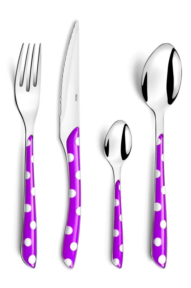 Eclat Dots komplet sztućców dla 6 osób 24 części w pudełku fioletowy Piękne, harmonijne zdobienia, romantyczny design oraz lekkość formy. Kolor urozmaica zastawę a elegancki pokrój pasuje do każdego pomieszczenia. Sztućce polerowane. Rączki z kolorowymi nakładkami idealnie dopasowane do dłoni w najmodniejszy wzór z kropkami. Można je myć w zmywarce, ale temperatura zmywania nie powinna przekraczać 40°, a poziom fosforanów w detergencie powinien być niższy niż 10%.Materiał stal 18/0.6 noży stołowych6 łyżek stołowych6 widelców stołowych6 łyżeczek do herbatyopakowanie ozdobneinstrukcja użytkowaniaGwarancja