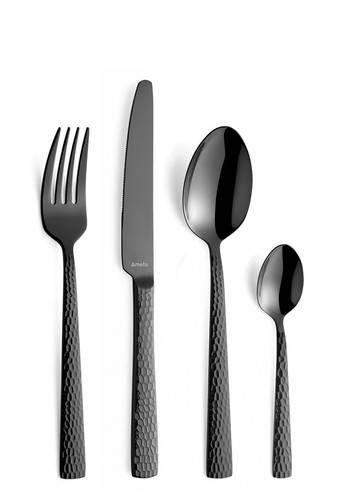 FELICITY Komplet sztućców dla 6 osób 24 cz. w pud. czarny Szukasz sztućców na co dzień, ale wyjątkowych? Czarne sztućce Felicity wprowadzają na stół poczucie kunsztu zgodnego z najnowszymi trendami. Kolekcję charakteryzuje szorstkie, młotkowane zdobienie na uchwycie w połączeniu z wykończeniem na wysoki połysk. . Można je myć w zmywarce, ale temperatura zmywania nie powinna przekraczać 40°, a poziom fosforanów w detergencie powinien być niższy niż 10%.