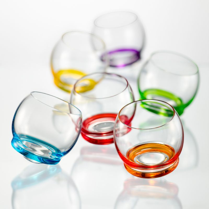 Szklanki zachwycają różnorodną kolorystyką oraz sprytnie zaokrąglonym kształtem. Mają charakterystyczną cechę, dolna część szklanki jest wypukła na zewnątrz, dlatego mogą się pochylać i tańczyć z wdziękiem wokół Ciebie bez przypadkowego rozlania ulubionego napoju.