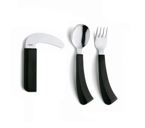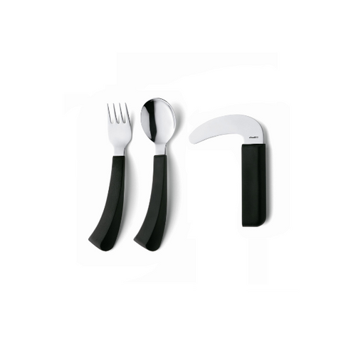 Ergonomicznie zaprojektowany, aby zapewnić osobom mającym trudności z chwytaniem i ograniczonym zakresem ruchu nadgarstka większą pewność przy stole. Te adaptacyjne przybory do jedzenia są wykonane z lekkiej stali nierdzewnej i wymagają od użytkownika mniejszej siły, aby osiągnąć doskonały rezultat. Sztućce zostały stworzone przez duńską projektantkę Karin Schou Andersen i sprawdzają się od lat 80-tych. Sztućce mają trwałą konstrukcję i solidne, czarne, zakrzywione uchwyty. W asortymencie dostępne są sztućce zarówno dla osób prawo-, jak i leworęcznych. Antypoślizgowy plastikowy uchwyt ABS z uchwytem jest wyjątkowo gruby i ukształtowany tak, aby był lekki i wygodny w dłoni. Dzięki ergonomicznym uchwytom jest łatwy do utrzymania, co czyni go idealną pomocą na co dzień dla seniorów, osób niepełnosprawnych czy pacjentów z chorobą Parkinsona. Nadają się do zmywarki.