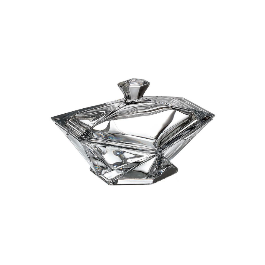 Kryształowa bomboniera została wykonana z najwyższej jakości szkła kryształowego. Szkło jest idealnie przejrzyste, a bomboniera pięknie prezentuje się na stole. Kryształowa bomboniera idealnie sprawdzi się np. na czekoladki, cukierki, ciasteczka; mniejszy rozmiar może służyć także jako cukiernica.