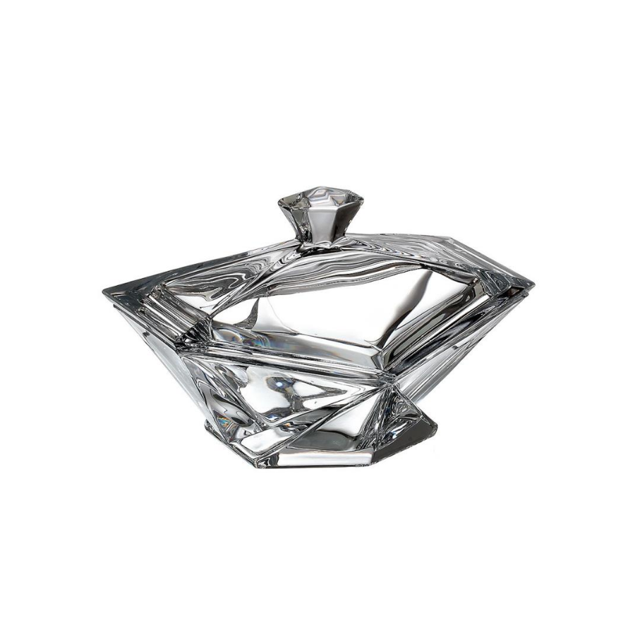 Kryształowa bomboniera została wykonana z najwyższej jakości szkła kryształowego. Szkło jest idealnie przejrzyste, a bomboniera pięknie prezentuje się na stole. Kryształowa bomboniera idealnie sprawdzi się np. na czekoladki, cukierki, ciasteczka; mniejszy rozmiar może służyć także jako cukiernica.