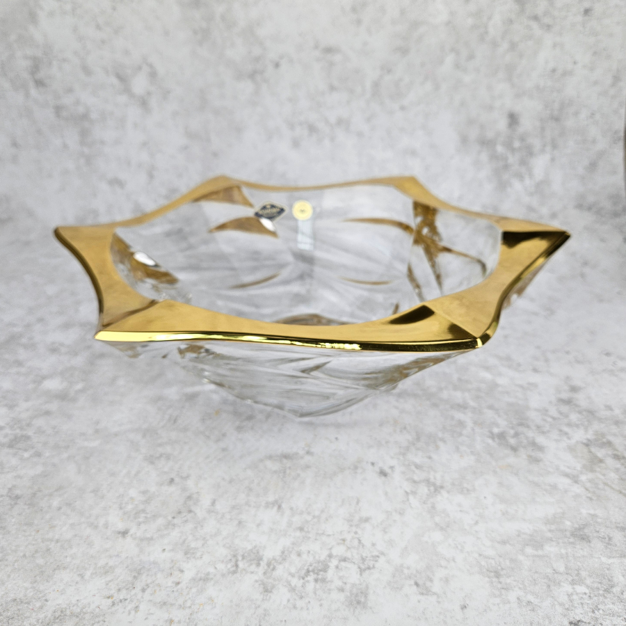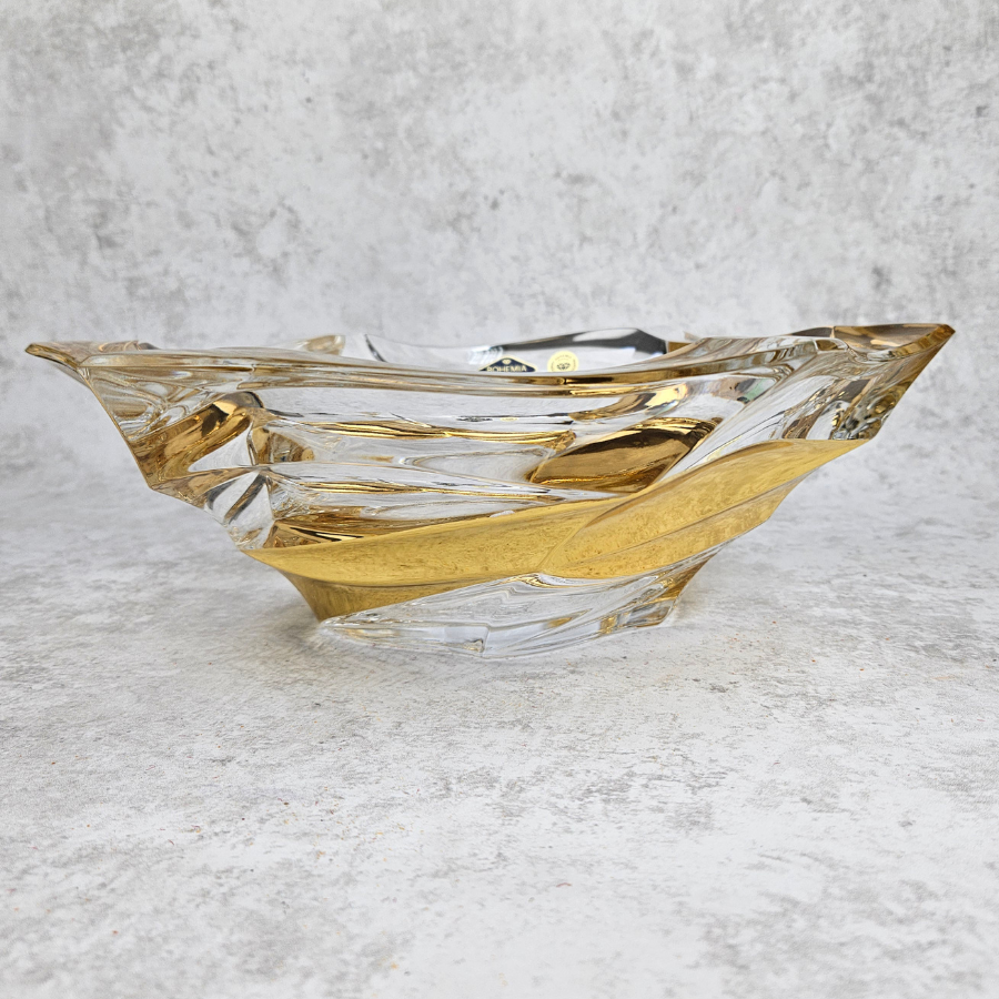 Kryształowa misa z linii Flamenco Belt Gold to nie tylko funkcjonalny element do serwowania owoców, słodyczy, ale także wyrafinowana dekoracja wnętrza, która zachwyca swoim designem i elegancją. Wykonana z wysokiej jakości szkła kryształowego, ta misa, emanuje luksusem i finezją.