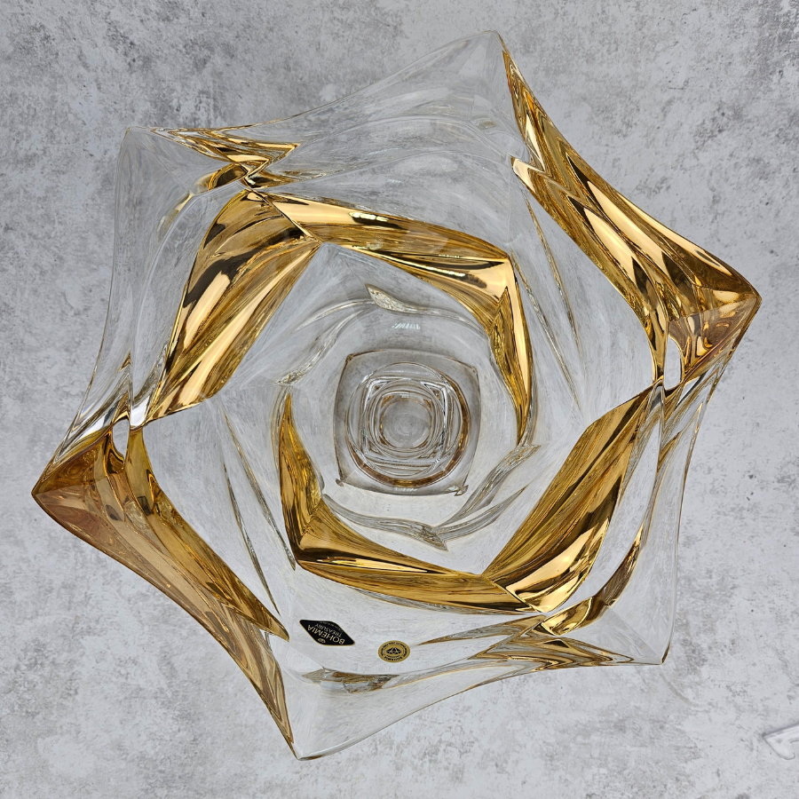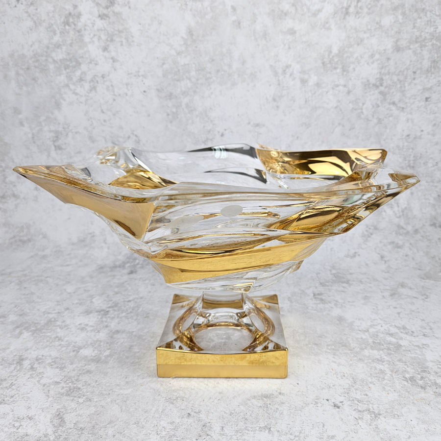 Kryształowa misa na nodze ze złotą dekoracją została wykonana z wysokiej jakości szkła kryształowego, idealnie nadaje się na owoce lub jako efektowna dekoracja lub jej element. Kryształowa misa świetnie sprawdzi się także w roli prezentu.
