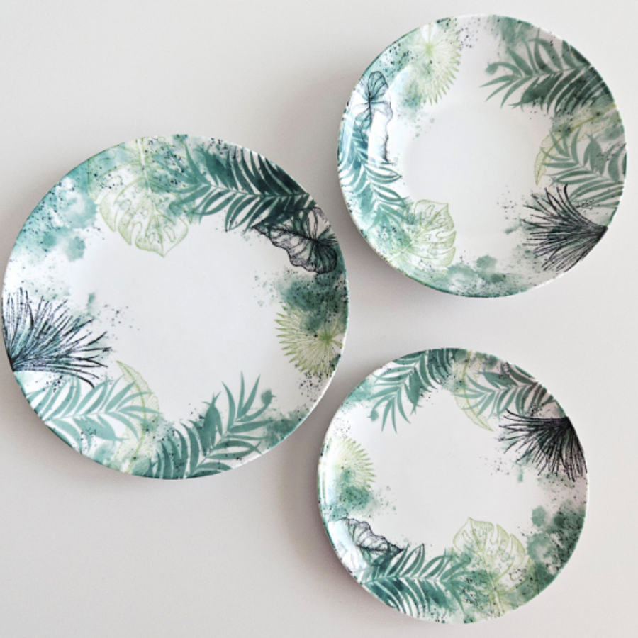 Elegancki komplet porcelanowych talerzy ozdobionych delikatnym, roślinnym motywem w odcieniach zieleni. Wzory liści palmowych i monstery subtelnie otaczają brzegi, tworząc harmonijną kompozycję przywołującą na myśl tropikalny ogród. Idealny do codziennych posiłków i wyjątkowych okazji, wprowadza do stołu świeżość i lekkość natury.