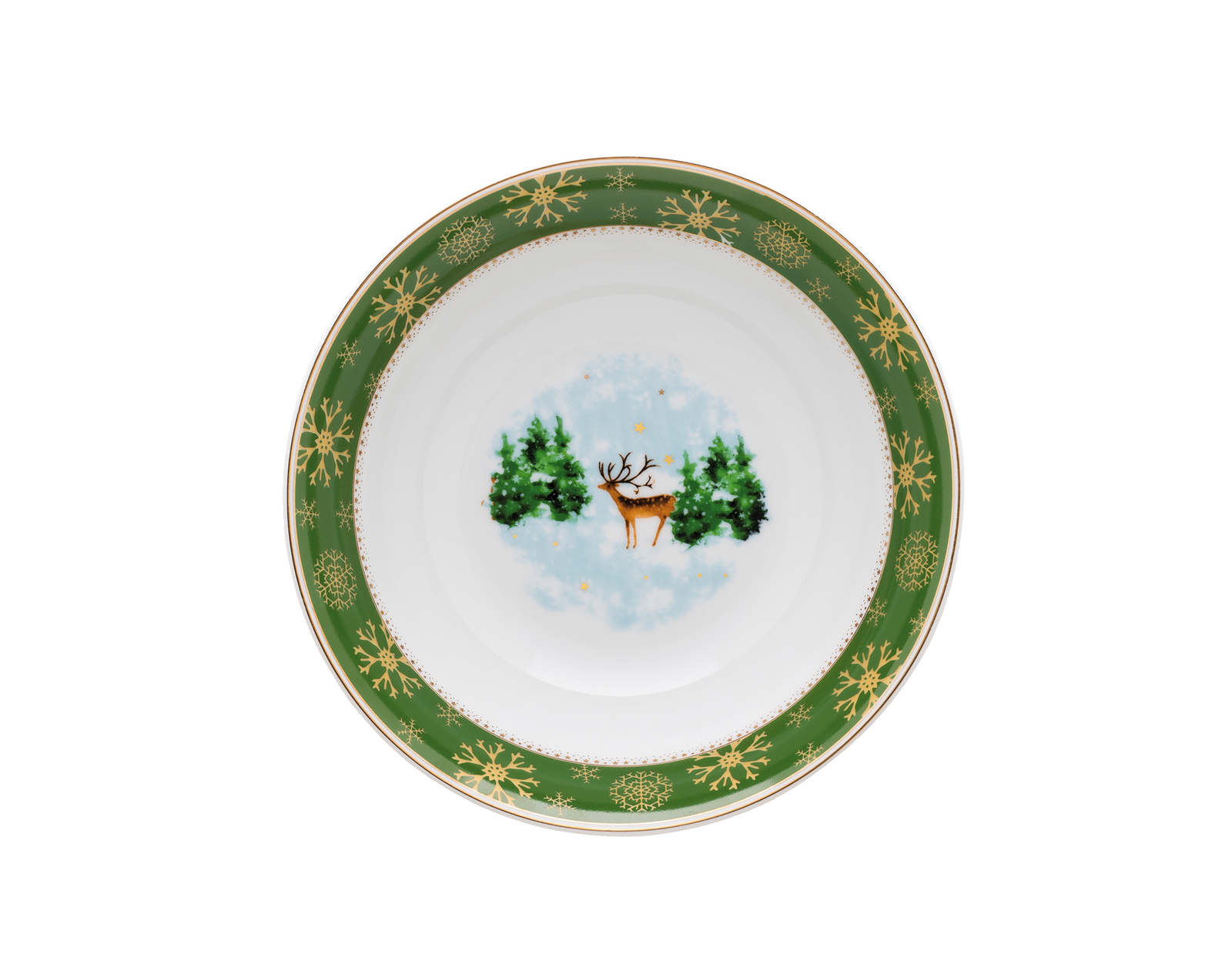 Kolekcja Bajkowe Święta to porcelana, która wygląda tak, jakby wyszła prosto z zimowej opowieści. Klasyczne, okrą głe talerze ze skrzydłami ozdobiono delikatną girlandą, na której połyskują złote gwiazdki. W centrum każdego ta lerza znajduje się jelonek, stojący na tle spokojnego, zasypanego śniegiem lasu. Jego obecność wprowadza na stół ciepło i łagodną magię świątecznych opowie ści. Niepowtarzalny charakter kolekcji podkreślają różne kolory porcelany: głęboka czerwień i klasyczna zieleń. Dzięki temu każdy może skomponować własną wersję świątecznej zastawy. W kolekcji znajdują się talerze, pół miski, sosjerka, salaterki, cukiernica, dzbanek i imbryk, które razem tworzą pełną, spójną opowieść. Każdy element jest jak kolejna scena tej samej baśni subtelnej, zimowej i pełnej uroku, któ rej magia potrafi przemienić zwykły posiłek w wyjątkowe świąteczne prze życie.