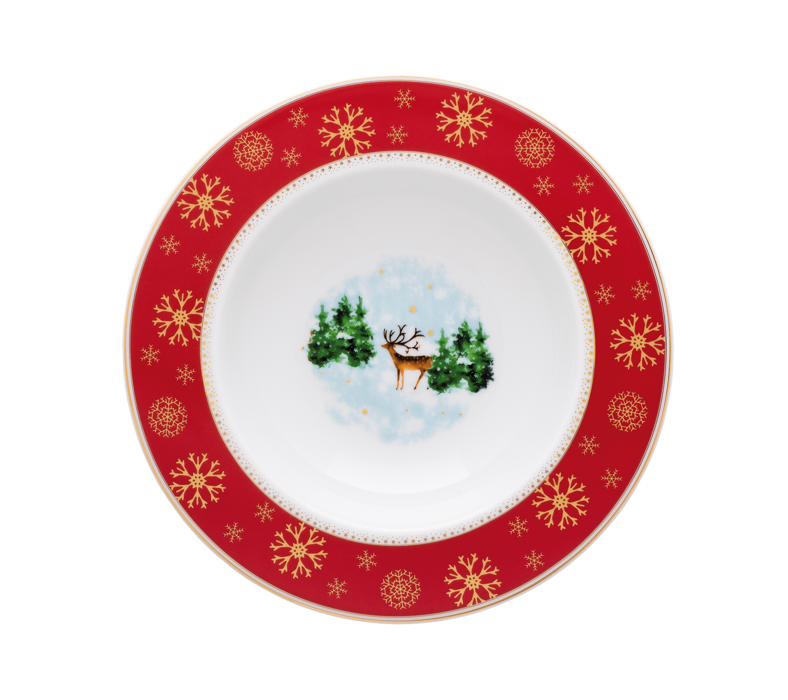 Kolekcja Bajkowe Święta to porcelana, która wygląda tak, jakby wyszła prosto z zimowej opowieści. Klasyczne, okrą głe talerze ze skrzydłami ozdobiono delikatną girlandą, na której połyskują złote gwiazdki. W centrum każdego ta lerza znajduje się jelonek, stojący na tle spokojnego, zasypanego śniegiem lasu. Jego obecność wprowadza na stół ciepło i łagodną magię świątecznych opowie ści. Niepowtarzalny charakter kolekcji podkreślają różne kolory porcelany: głęboka czerwień i klasyczna zieleń. Dzięki temu każdy może skomponować własną wersję świątecznej zastawy. W kolekcji znajdują się talerze, pół miski, sosjerka, salaterki, cukiernica, dzbanek i imbryk, które razem tworzą pełną, spójną opowieść. Każdy element jest jak kolejna scena tej samej baśni subtelnej, zimowej i pełnej uroku, któ rej magia potrafi przemienić zwykły posiłek w wyjątkowe świąteczne prze życie.