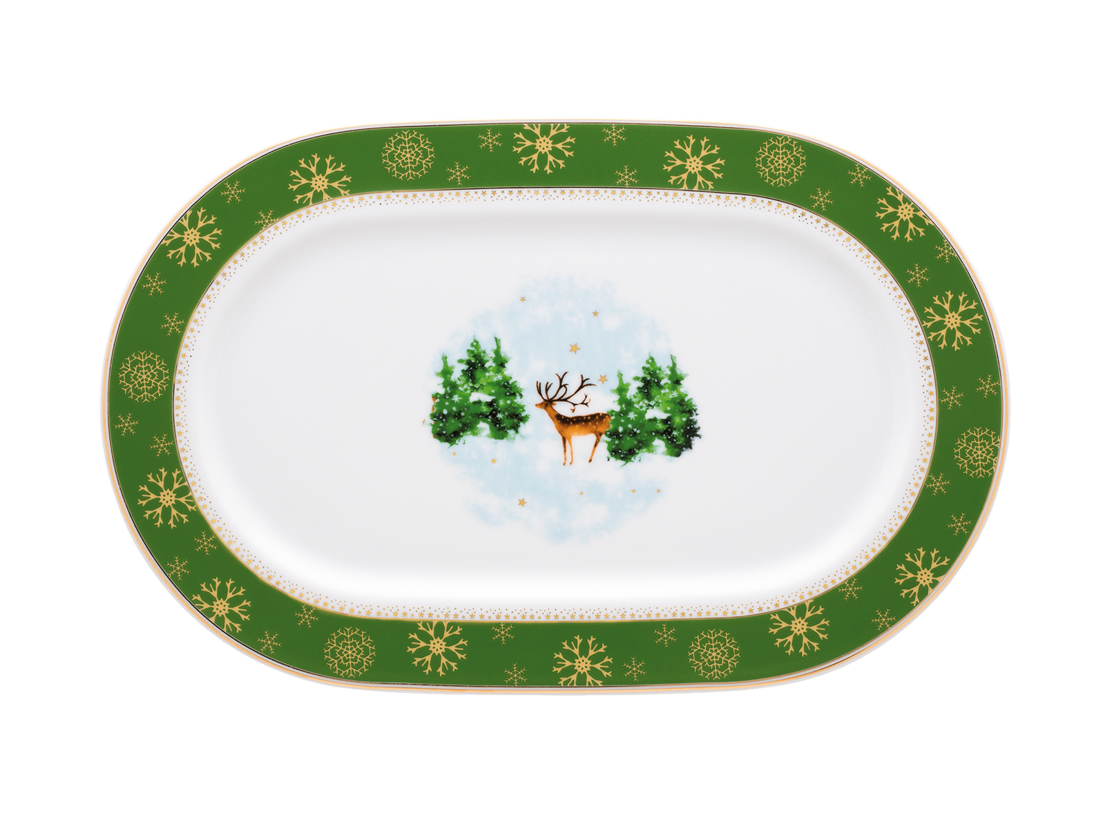 Kolekcja Bajkowe Święta to porcelana, która wygląda tak, jakby wyszła prosto z zimowej opowieści. Klasyczne, okrągłe talerze ze skrzydłami ozdobiono delikatną girlandą, na której połyskują złote gwiazdki. W centrum każdego talerza znajduje się jelonek, stojący na tle spokojnego, zasypanego śniegiem lasu. Jego obecność wprowadza na stół ciepło i łagodną magię świątecznych opowie ści. Niepowtarzalny charakter kolekcji podkreślają różne kolory porcelany: głęboka czerwień i klasyczna zieleń. Dzięki temu każdy może skomponować własną wersję świątecznej zastawy. W kolekcji znajdują się talerze, pół miski, sosjerka, salaterki, cukiernica, dzbanek i imbryk, które razem tworzą pełną, spójną opowieść. Każdy element jest jak kolejna scena tej samej baśni subtelnej, zimowej i pełnej uroku, której magia potrafi przemienić zwykły posiłek w wyjątkowe świąteczne prze życie.