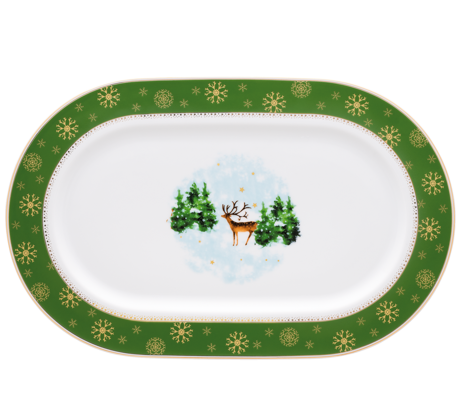 Kolekcja Bajkowe Święta to porcelana, która wygląda tak, jakby wyszła prosto z zimowej opowieści. Klasyczne, okrągłe talerze ze skrzydłami ozdobiono delikatną girlandą, na której połyskują złote gwiazdki. W centrum każdego talerza znajduje się jelonek, stojący na tle spokojnego, zasypanego śniegiem lasu. Jego obecność wprowadza na stół ciepło i łagodną magię świątecznych opowie ści. Niepowtarzalny charakter kolekcji podkreślają różne kolory porcelany: głęboka czerwień i klasyczna zieleń. Dzięki temu każdy może skomponować własną wersję świątecznej zastawy. W kolekcji znajdują się talerze, pół miski, sosjerka, salaterki, cukiernica, dzbanek i imbryk, które razem tworzą pełną, spójną opowieść. Każdy element jest jak kolejna scena tej samej baśni subtelnej, zimowej i pełnej uroku, któ rej magia potrafi przemienić zwykły posiłek w wyjątkowe świąteczne prze życie.