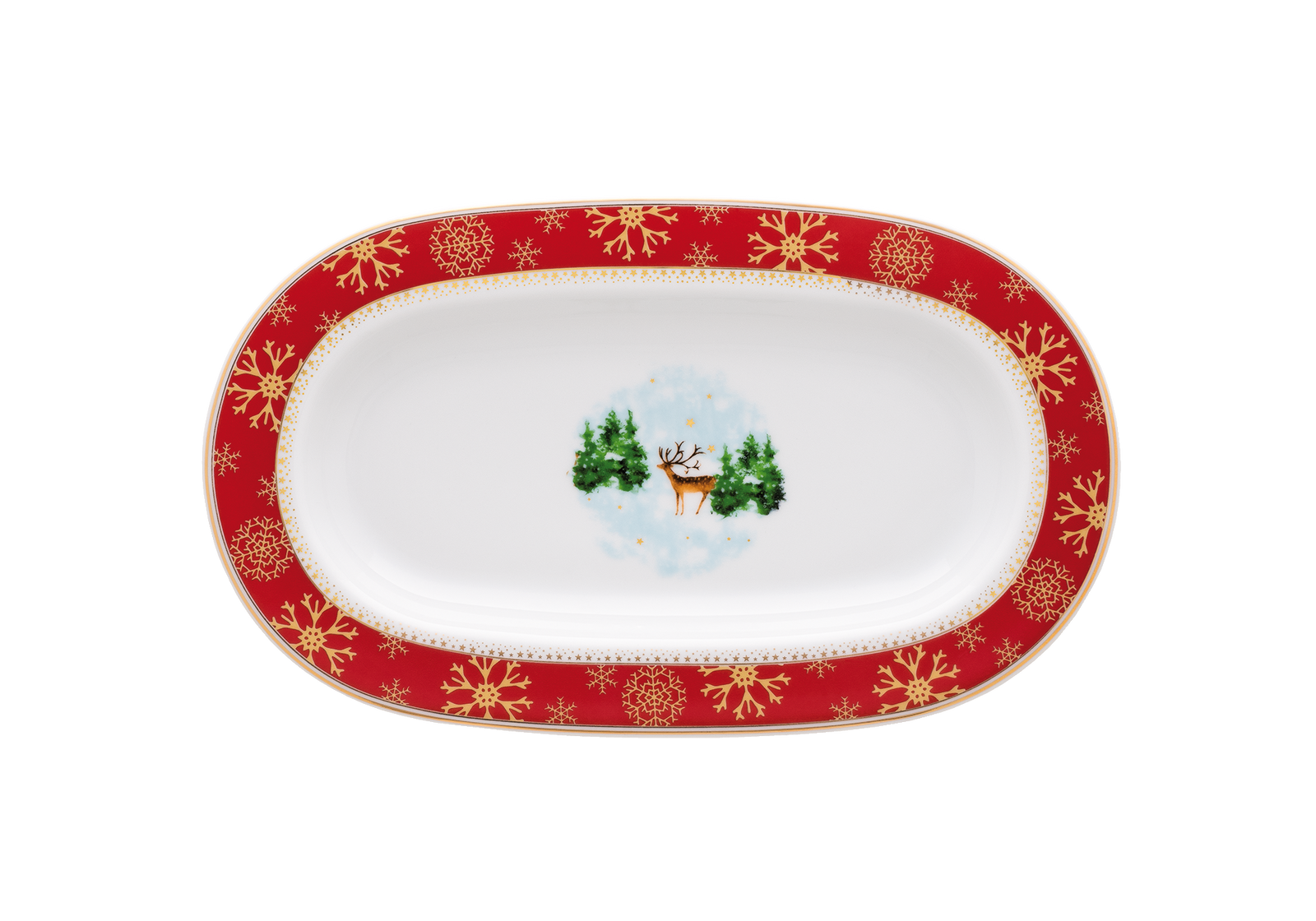 Kolekcja Bajkowe Święta to porcelana, która wygląda tak, jakby wyszła prosto z zimowej opowieści. Klasyczne, okrągłe talerze ze skrzydłami ozdobiono delikatną girlandą, na której połyskują złote gwiazdki. W centrum każdego talerza znajduje się jelonek, stojący na tle spokojnego, zasypanego śniegiem lasu. Jego obecność wprowadza na stół ciepło i łagodną magię świątecznych opowieści. Niepowtarzalny charakter kolekcji podkreślają różne kolory porcelany: głęboka czerwień i klasyczna zieleń. Dzięki temu każdy może skomponować własną wersję świątecznej zastawy. W kolekcji znajdują się talerze, pół miski, sosjerka, salaterki, cukiernica, dzbanek i imbryk, które razem tworzą pełną, spójną opowieść. Każdy element jest jak kolejna scena tej samej baśni subtelnej, zimowej i pełnej uroku, któ rej magia potrafi przemienić zwykły posiłek w wyjątkowe świąteczne prze życie.