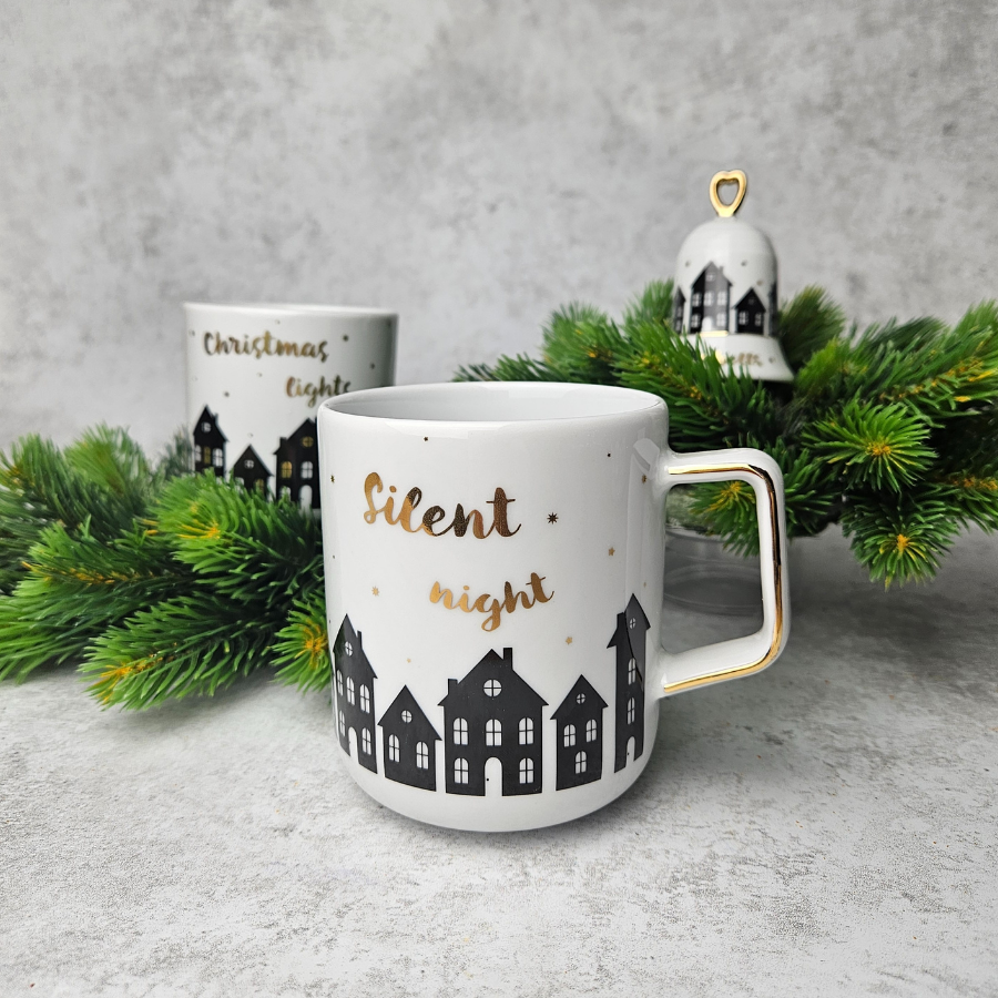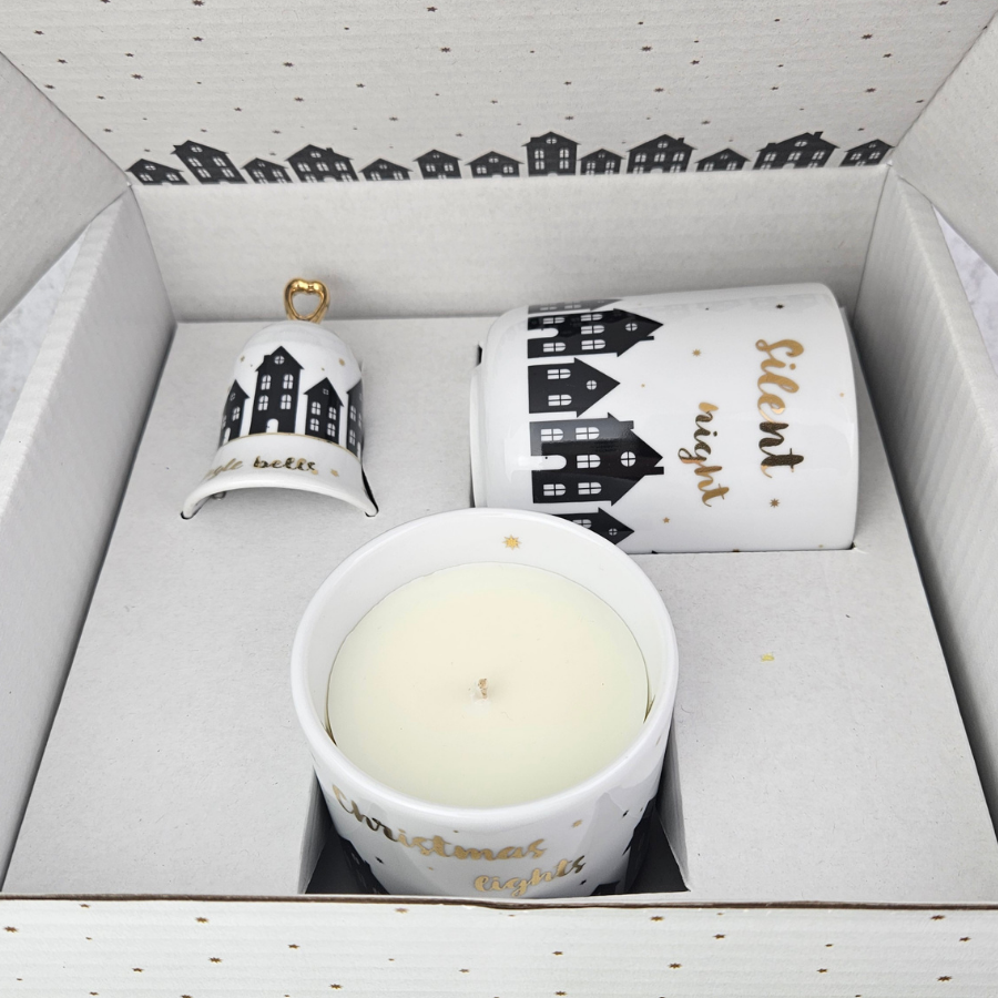 Kolekcja Christmas Songs to porce lana, która rozbrzmiewa świąteczną melodią. Każdy zestaw łączy dzwonek, świecę i kubek w małe instrumenty codziennej radości, które razem tworzą nastrój grudniowych wieczorów. Dwa warianty zestawu przywołują znane, zimowe piosenki: biały kubek z czarnymi domkami, złotymi gwiazd kami i napisem Silent Night opowiada o spokojnych, cichych wieczorach przy blasku świecy, kiedy każdy dźwięk wydaje się pełen magii. Czarny ku bek z białymi domkami, śnieżkami i napisem Let it Snow wprowadza radosną energię zimowego śniegu, jak melodia wesołej, świątecznej piosenki. Dzwonek i świeca dopełniają całości, niczym akordy w ulubionej kolędzie razem tworzą harmonijną, ciepłą opo wieść o świętach. Christmas Songs to kolekcja, która pozwala poczuć muzykę grudnia w każdym małym detalu przy kubku gorącego napoju, blasku świecy, dźwięku dzwonka, który wprowadza w świąteczny nastrój.