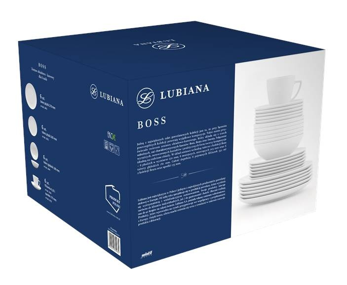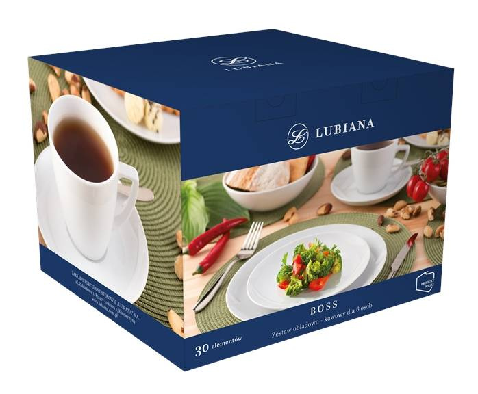 Jedną z największych zalet porcelanowych kolekcji jest to, że przy łączeniu poszczególnych kolekcji powstają wyjątkowe kompozycje. Takie motto przyświecało twórcom zestawu obiadowo-kawowego, który składa się z trzech subtelnych, zaś charakterystycznych fasonów: Boss, Beata oraz Dorota. Połączenie wyraźnych, nowoczesnych kształtów i praktycznych form tworzy kompozycje idealną na rodzinne obiady. W skład zestawu wchodzą: talerze z kolekcji Boss – 6 płaskich w wymiarze 270 mm, 6 mniejszych, mierzących 205 mm oraz 6 talerzy głębokich 180 mm. Całość dopełnia: 6 pojemnych filiżanek 350 ml z kolekcji Beata oraz spodki 175 mm.